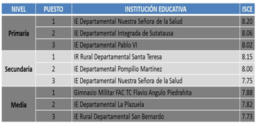 Reconocimiento La Ministra de Educación Gina Parody reconoció esfuerzo de colegios de Cundinamarca que superaron su meta de mejoramiento en calidad educativa, dando a conocer los nombres de los mejores colegios del departamento, por nivel, de acuerdo al Índice Sintético de Calidad, entre ellos se encuentra el nuestro ocupando el segundo puesto en educación media.