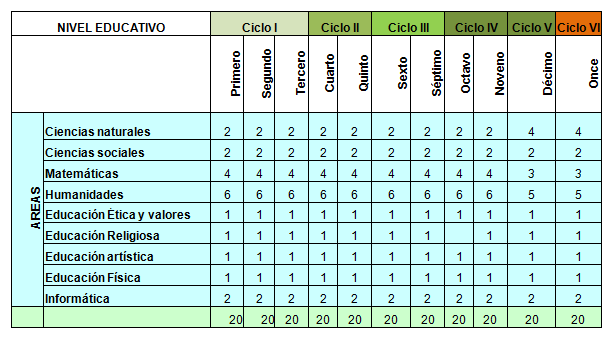 El plan de estudios es un componente curricular que debe cumplir por lo determinado por la ley 115 de 1994 en los artículos: Art. 23 (Áreas obligatorias y fundamentales), Art 28 (Carácter de la educación media), Art. 31 (Objetivos de la educación media académica) y el Art. 32 (Educación media técnica)  y del Decreto 1860 de 1994 en el Art 34 (Áreas Obligatorias y Fundamentales), Art. 35 (Desarrollo de Asignaturas), Art. 36 (Proyectos pedagógicos), Art. 38 (Plan de estudios), Art. 39 (Servicio social estudiantil) y Art. 41(Áreas de la educación media técnica).